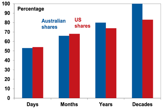 Fourthly, don’t check your investments so much. If you track the daily movements in the Australian All Ords price index, measured over the last twenty-five years or so it has been down almost as much as it has been up (see the next chart). It’s little different for the US S&P 500. So, each day is pretty much a coin toss as to whether you will get good news or bad as markets are thrown around by the daily noise. By contrast, if you only look at how the share market has gone each month and allow for dividends, historical experience tells us you will get bad news less than 35% of the time. Looking only on a calendar year basis, data back to 1900 indicates that the probability of bad news in the form of a loss slides further to just 20% of the time for Australian shares and less than 30% for US shares. And if you can stretch it out to once a decade, again since 1900, positive returns have been seen 100% of the time for Australian shares and 82% of the time for US shares.