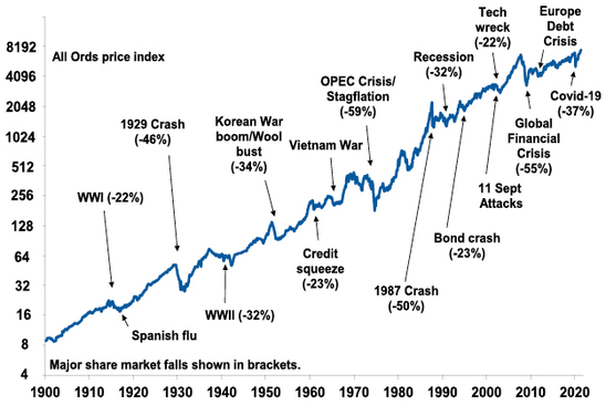 Firstly, put the latest worry in context. There’s always been an endless stream of worries. Here’s a partial list since 1900: 1906 San Francisco earthquake; 1907 US financial panic; WWI; 1918 Spanish flu pandemic (up to 50 million killed); The Great Depression; WW2; Korean War; 1957 flu pandemic; 1960 credit crunch; Cuban missile crisis; Vietnam War; 1968 flu pandemic; 1973 OPEC oil embargo; Watergate; the cancellation of The Brady Bunch; stagflation in the 1970s; the 1979 oil crisis; Latin American debt crisis; Chernobyl disaster; 1987 crash; First Gulf War; Japanese bubble economy collapse; US Savings & Loan crisis; Asian crisis; Tech wreck; 9/11 terrorist attacks; Second Gulf War; the GFC; the Eurozone public debt crisis; US trade wars; President Trump; & the coronavirus pandemic. But despite this investment returns have actually been good as shares climb a long-term wall of worry with the result being that since 1900 Australian shares have returned 11.8% pa and US shares 10% pa (including capital growth and dividends).