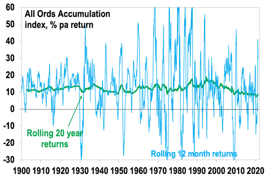 Australian share returns over over rolling 12 mth & 20 yr periods