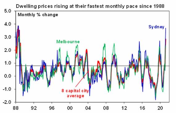 Average dwelling prices in Australian capital cities rose by 2.8% in March, their seventh consecutive monthly gain and the largest in more than 30 years. Prices are now up by 3.5% on previous record highs and almost 5% on pre-pandemic levels. Homeowners across the country are sharing in the good fortune, with Perth and Darwin the only two cities where residential property prices have not recently surpassed their previous high-water marks. Incredibly, regional markets have run even stronger over the past twelve months, up 11.4% on a year ago.