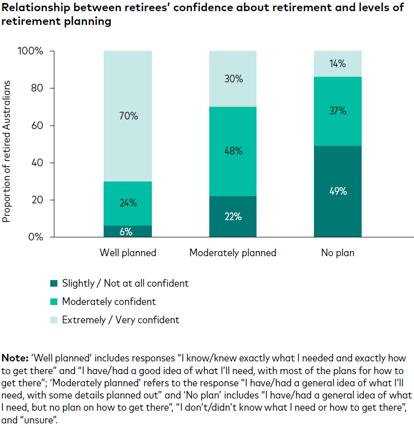 Retirees who were well planned and knew exactly or had a good idea of what actions they need to take to prepare for retirement are four-times more likely to be highly confident about retirement than those who did not have a plan upon retiring.