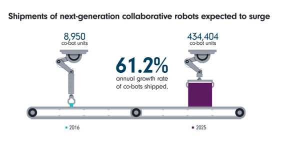 The next generation of industrial robots, called collaborative robots or ‘co-bots,’ incorporate artificial intelligence and motion sensing ability, with which they can work more safely and efficiently alongside human workers, and require less sophistication to programme. Loup Ventures said in a report last year that it expects total co-bot units shipped to increase to 434,404 by 2025 from 8,950 in 2016, representing a compound annual growth rate of 61.2 per cent.20