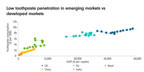 Oral care will benefit from the dual demographic trends of growing affluence in developing economies and ageing populations. In some emerging markets, frequency of brushing, and toothpaste use are still low, suggesting ample room for growth. For instance, the American Dental Association recommends 1 milliliter of toothpaste per brush, but the average toothpaste use per day is only 0.64 milliliters China and 0.35 milliliters in India.8 As countries become wealthier, people can be expected to trade up to more expensive oral goods, such as whitening products.