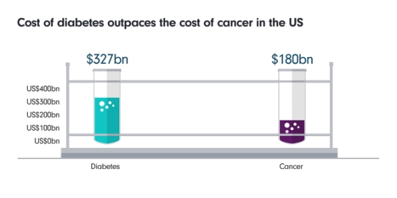 The total cost of diabetes has been estimated at more than $720 billion in 2017 and of this, more than 80 per cent is indirectly related to diabetes – cardiovascular diseases, blindness, renal/dialysis, amputation and general hospitalisation.11