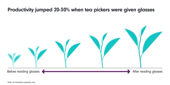 Vision correction could have a huge impact on overall economic activity. A recent study published in the Lancet journal found that productivity among tea-pickers in the Indian state of Assam rose by 21 per cent when half over the age of 40 were given simple reading glasses. Tea-pickers over the age of 50 recorded even bigger gains, at 31 per cent.14