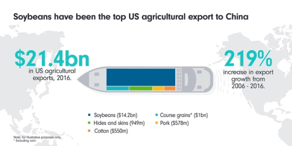 Growing prosperity in the region means that more Asians are able to afford to consume meat. Demand for pork in China has soared so much that half of the world’s pigs are now reared there. Feeding this ever-increasing livestock population is a challenge, as it takes about three kilograms of feed to produce each kilogram of meat. Soybeans, which are mainly grown in the sunny corn belt of the US and South America, are the main source of animal feed. China is the world’s largest consumer of soybeans, and until recently was one of the biggest importers of US soybeans.