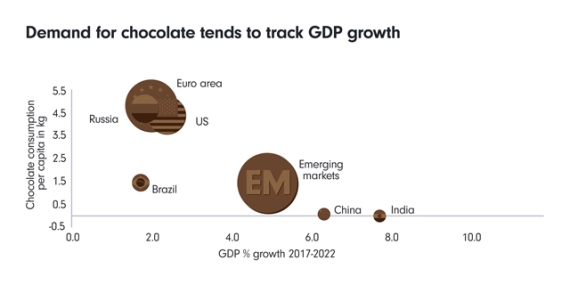 Asia is an underpenetrated market compared with developed countries. For instance, per capita consumption of chocolate in Switzerland is 8.8 kilograms a year, a lot more than the 100 grams a year consumed by the average person in China or the 200 grams in India.5