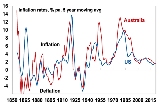 This occurs because investors switch out of safe haven bonds to invest in growth assets like shares, borrowing increases and saving declines. The next chart shows US and Australian 10 year bond yields since 1990 and highlights several moves higher – in 1994 after the early 1990s recession, in the mid-2000s after the tech wreck, after the GFC, in 2013 after the 2011-12 growth slowdown (the “taper tantrum”) and after the 2015 global growth scare. These increases have ranged from 1.5% to 4.3% (in 1994 in Australia). The latest move is not unusual historically, although it has been very rapid this year.