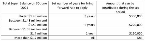 As an example, if a person has a total super balance of $1.3 million on 30 June 2021 and makes a non-concessional contribution of greater than $110,000 during the 2021/22 financial year, they will trigger the bring forward rule and can then contribute up to $330,000 at any time during the 2021/22, 2022/23 or 2023/24 financial years.