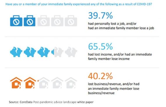 CoreData’s research shows that almost four in 10 (39.7%) people have personally lost their job or had an immediate family member lose their job. Furthermore, almost two-thirds (65.5%) of people have personally lost income or had an immediate family member lose income. And four in 10 (40.2%) people who run a business have personally seen it lose revenue, or had an immediate family running a business that has lost revenue.
