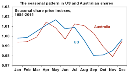 The seasonal pattern appears to reflect some combination of tax loss selling by US mutual funds around the end of their tax year that sees them sell losing stocks around September in order to reduce their clients’ capital gains bill, followed by having to buy shares back in November, the investment of year-end bonuses, New Year optimism and the absence of capital raising over the Christmas/New Year period all serving to drive shares higher from around October/November, which then peters out around May giving way to weakness that’s accentuated by tax loss selling in the September quarter, etc. Of course this may not be the whole story because the seasonal pattern may date back to agricultural crop cycles which saw merchants withdraw their money from financial assets at the end of summer to pay for the summer crop and then having to reinvest into year end.