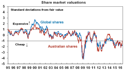 Second, valuations for most share markets are not onerous. While price to earnings multiples for some markets are a bit above long term averages, valuation measures that allow for low interest rates and bond yields show shares to be cheap.