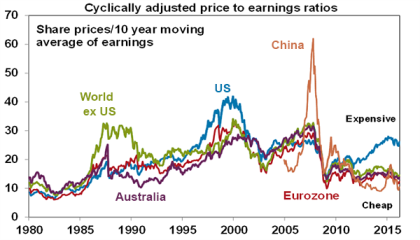 Third, while the US share market may be vulnerable on some measures other share markets are not. Specifically if US shares are compared to a 10 year moving average of earnings (which is often referred to as a Shiller or cyclically adjusted PE) then they are a bit expensive and of course monetary conditions in the US are gradually tightening. However, the so-called Shiller PE is actually cheap for most markets globally including Eurozone, Chinese and Australian shares (see the next chart).