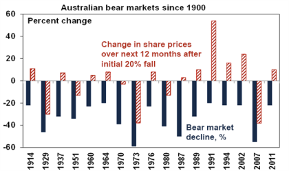 This is very important. Ignoring the most recent fall, since 1900 there have been 17 bear markets in Australian shares (defined as a 20% plus falls). Of these 11 saw shares higher a year after the initial 20% decline with an average gain of 14%. Of course the remaining 6 pushed further into bear territory with average falls over the next 12 months, after having declined by 20%, of an additional 22.5%. Stockbroker Credit Suisse, albeit focussing only on the period from the 1970s, called these Gummy bears and Grizzly bears respectively.