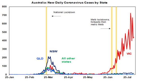 In addition to this, there will be more pressure on the federal government for stimulus, as growth takes more of a hit than forecast in the current quarter from the situation in Victoria. As such, we can expect more support measures from Canberra in the months ahead.
