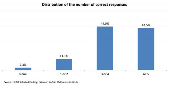 The 2018 Household, Income and Labour Dynamics in Australia (HILDA) Survey, conducted by the University of Melbourne’s Melbourne Institute, provides a comprehensive objective snapshot (as opposed to a subjective self-rated assessment) of Australians’ financial literacy by asking five questions about basic financial concepts (see box for the questions).