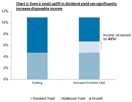 For a typical retiree this represents too much growth and not enough income. Increasing dividend yield above this level can significantly increase retirement income, while still providing enough growth to maintain or grow the real value of the income stream over time. The example in chart 1 highlights the fact that a relatively small 2.0% p.a. increase in dividend yield would increase disposable income for a retiree by 43.0% while still maintaining growth well above inflation.