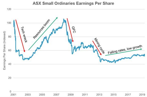Australian small cap stocks have failed to live up to their potential in recent times. By definition, small cap companies are generally at an earlier stage of their life cycle with good growth opportunities ahead, and in an environment of record low interest rates and freely available money for companies to expand their operations, it would be expected that they are growing strongly and generating good returns. Some are doing just that, however it may surprise investors that the aggregate level of earnings generated by companies in the ASX Small Ordinaries Index has consistently declined since 2008 when the Global Financial Crisis (GFC) hit.