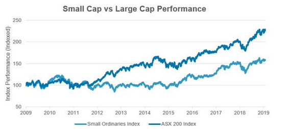 The factors highlighted above go a long way to explaining the underperformance of small caps stocks compared to their large cap counterparts over this time period. In fact, since small cap earnings bottomed after the GFC in September 2009, the Small Ordinaries Accumulation Index has underperformed the ASX 200 Accumulation Index by 70% in aggregate. It’s interesting that an index dominated by banks and diversified miners has substantially outperformed an index which has contained material exposure to stocks which have captured investor’s attention over the past few years including technology, Chinese consumer consumption (e.g. infant formula and vitamins), electric vehicles and gold.
