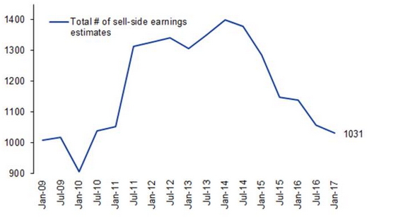 The above chart also shows that sell side analysts have added very little value when picking earnings over this period and investing by following consensus earnings leads to underperformance. In fact, since 2001 a portfolio of small cap stocks with the highest growth forecast by consensus has provided a return of -2% per annum, or -29% in aggregate. This isn’t a huge surprise given sell-side analyst forecasts are typically a lagging indicator. This is further exacerbated by the number and quality of earnings estimates in the Australian small cap market falling dramatically over the past few years.