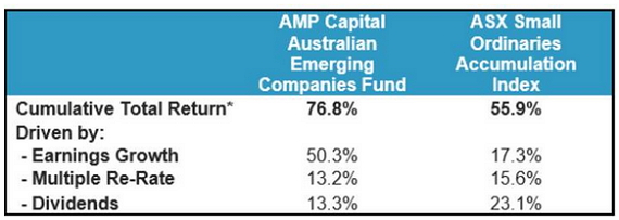 The AMP Capital Australian Emerging Companies Fund has returned 11.5% per annum (after-fees) over the same period (76.8% cumulative return), with earnings growth contributing the majority of returns, which is aligned to our investment philosophy and process. The ability to pick stocks which are growing earnings consistently has been the major driver of the Fund’s outperformance.