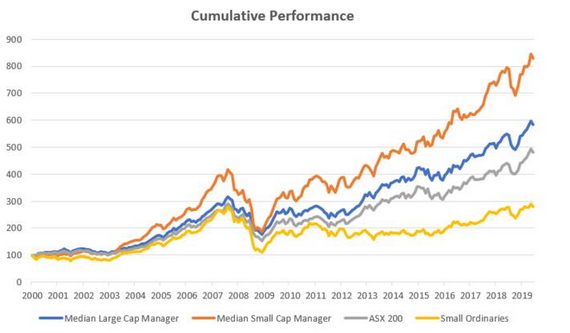 Despite the relatively gloomy picture we have presented for small cap earnings, there is one major reason for optimism in small caps. The median small cap manager has significantly outperformed not only the ASX Small Ordinaries Index, but also the ASX 200 Index and the median large cap manager over a long time period. Investors who have trusted their money with even a middle of the pack small cap manager have seen excellent compound returns over this period. The Australian small caps market is inefficient and not well researched, providing good managers with the opportunity to find new information which gives them an edge in picking stocks.