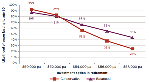 Impact of spending strategy and investment option on likelihood of super lasting to age 90