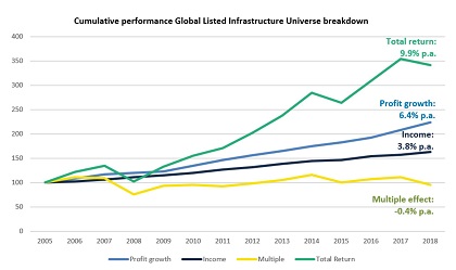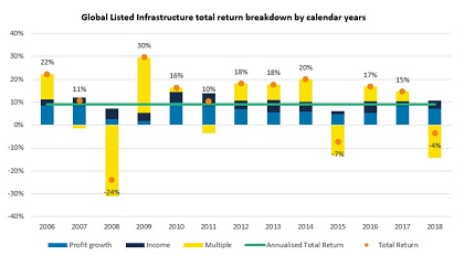 Past performance is not a reliable indicator of future performance. Source: AMP Capital, Bloomberg as at 31 December 2018. Data frequency: quarterly. Data based on the AMP Capital’s Global Listed Infrastructure universe.