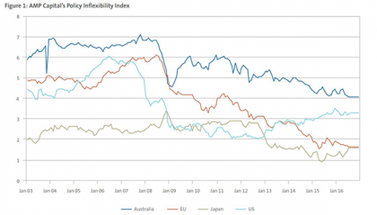 Figure 1 shows the Policy Inflexibility Indices for Australia, the EU, Japan and the United States. There are a number of notable observations: