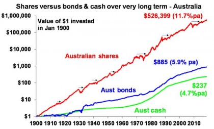 Of course, this gives me an opportunity to again show my favourite chart on investing which tracks the value of $1 invested in Australian shares, bonds and cash since 1900 with dividends and interest reinvested along the way. Cash is safe but has low returns and that $1 will have only grown to $237 today. Shares are volatile (& so have rough periods highlighted by arrows) but if you can look through that they will grow your wealth and that $1 will have grown to $526,399 by today.