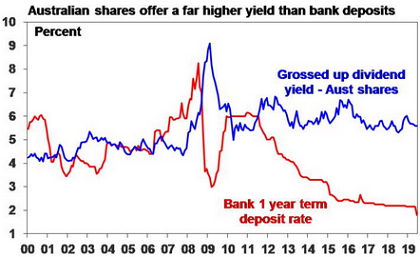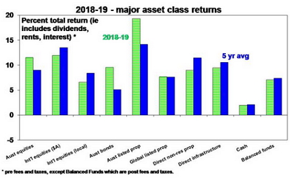 Cash and bank deposits had poor returns not helped by the RBA cutting the cash rate to a new record low in June. But bonds had a spectacular turnaround as rising bond yields on the back of Fed tightening a year ago gave way to plunging yields – to record lows in many countries – as inflation subsided and central banks turned dovish resulting in Australian bonds returning 9.6%. The plunge in bond yields reinvigorated the search for yield and so helped yield-sensitive listed property and infrastructure have strong returns. Unlisted property and infrastructure continued to do well, despite a rougher ride for retail property. Balanced growth superannuation funds are estimated to have returned around 7% after taxes and fees. For the last five years their returns have averaged around 7.4% pa, which is not bad given sub 2% inflation.