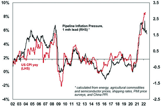 The Inflation Pipeline Indicator is based on commodity prices, shipping rates and PMI price components. Source: Macrobond, AMP