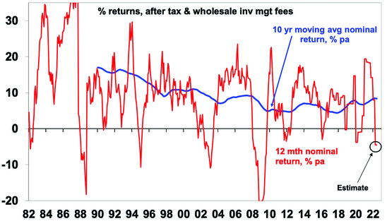 Conservative superannuation funds are likely to have had a similar or worse loss in the financial year reflecting the hit to bond returns. Normally bonds are a safer less volatile asset class than shares, and so conservative funds tend to have a higher exposure to them than shares. However, every so often bonds have a rough ride at the same time as shares – usually when inflation is a big problem and central banks are raising interest rates which pushes up bond yields rapidly resulting in negative returns from both fixed income (as bonds suffer a capital loss when yields rise) & shares. The result is that both conservative and balanced growth funds can have poor returns in such environments as we have seen over the last year.