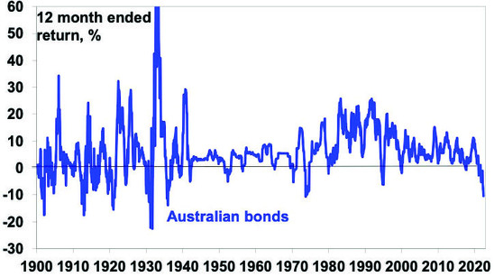 Bonds have had their worst 12 month return in decades as the surge in bond yields resulted in capital losses for investors. Australian bonds lost 10.5% over the last 12 months which is worse than their losses in the “bond crash” of 1994 and looks to be their worst 12 month loss since the 1973 or the 1930s. The severity of the loss reflects the low starting point yield and the speed of the rise in bond yields.