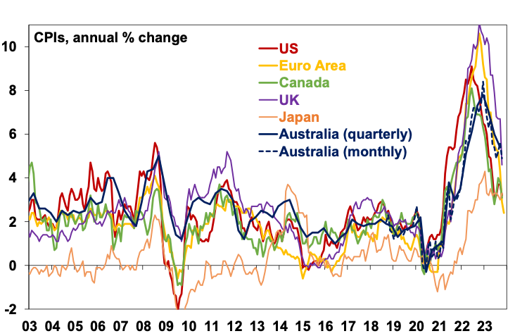 Disinflation. Inflation across major countries has fallen sharply from peaks of 8 to 11% last year to around 2 to 5%. Australia lagged on the way up and is doing the same on the way down, but it’s falling too.