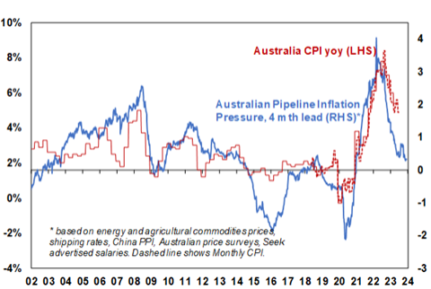 However, there is reason for optimism. First, inflation has eased sharply to around 3% in major industrial countries and around 5% in Australia and is likely to continue to fall as: supply chain pressures have reversed; demand is cooling; and labour markets are easing with sharp falls in job vacancies. This includes in Australia which lagged US inflation on the way up and is just doing so again on the way down with our Inflation Indicator pointing to a further sharp fall.