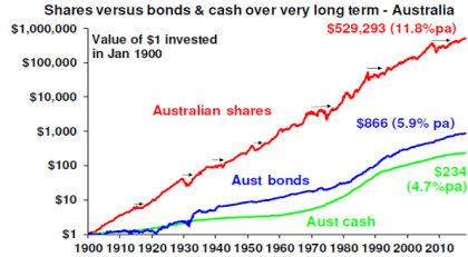 In investing time is your friend and the earlier you start the better. This is the best way to take advantage of the magic of compound interest. The next chart – my favourite – shows the value of $1 invested in various Australian asset classes since 1900 allowing for the reinvestment of any income along the way. That $1 would have grown to just $234 if invested in cash, $866 in bonds but a whopping $529,293 if invested in shares.