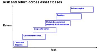 This chart is basic to investing. Each asset class has its own risk (in terms of volatility and risk of loss) and return characteristics. Put simply: the higher the risk of an asset, the higher the return you will likely achieve over the long term and vice versa. The next chart shows a stylised version of this. Starting with cash (and bank deposits), it’s well known that they are very low risk but so is their return potential. Government bonds usually offer higher returns but their value can move around a bit in the short term (although major developed countries have not defaulted on their bonds). Corporate debt has a higher return potential again but a higher risk of default – particularly for junk bonds. Corporate debt is basically a hybrid between equities & government bonds. Unlisted or directly held commercial property and infrastructure offer a higher return again but they come with higher risk and are less liquid and can be less able to be diversified (although this can be remedied by investing via a managed fund). Equities can offer another step up in return but this is because they come with higher risk as they are subject to share market volatility and individual companies can go bankrupt wiping out share holder capital. Beyond this, private equity entails more risk again and so tends to command an even higher return premium. Each step up involves more risk and this is compensated for with more return.