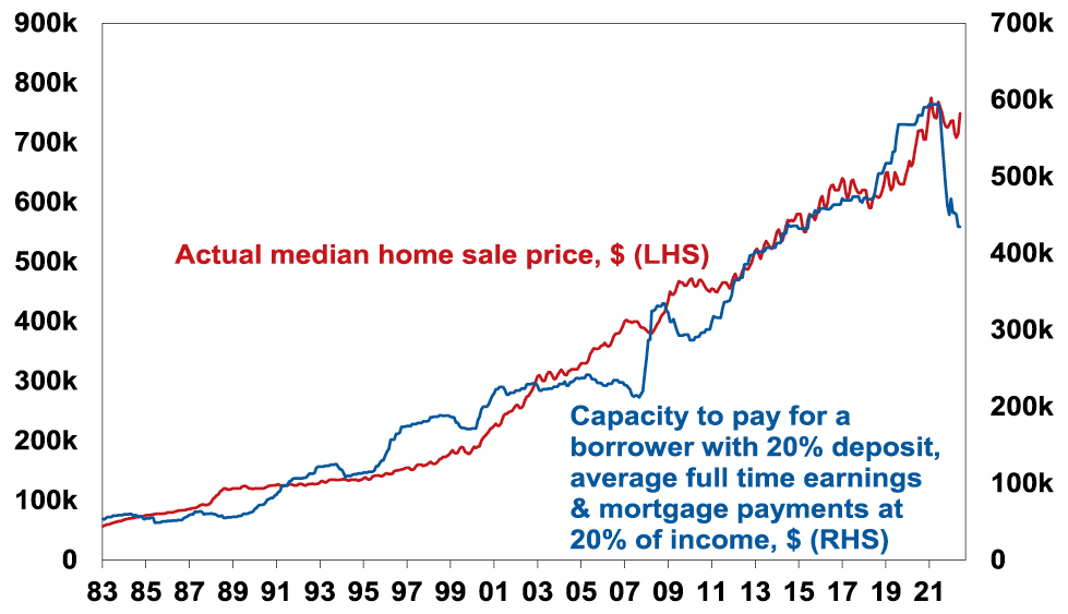 The hit to home buying capacity from rate hikes – of 27% for a buyer with a 20% deposit and average full-time earnings – remains, even if rates have stopped rising. See the next chart. There was a divergence versus prices in 2003-2008 when buyer capacity fell as rates rose but prices rose due to a surge in demand from high immigration levels associated with the mining boom with the divergence ultimately eliminated with the rapid rate cuts in the GFC. This time around we are seeing a similar supply shortfall, but rapid rate cuts are unlikely. So, this is likely to remain on ongoing constraint on buyer demand.