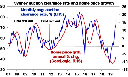 This has so far come on low volumes, but they now look to be rising. Our base case is that house price gains will be far more constrained than the 10-15% implied by current auction clearance rates. Compared to past cycles debt to income ratios are much higher, bank lending standards are tighter, the supply of units has surged with more to come and this has already pushed Sydney’s rental vacancy rate above normal levels and unemployment is likely to drift up as economic growth remains soft. So, we don’t expect to see a return to boom time conditions and see constrained gains through 2020 – eg around 5% or so. There are three key things to watch: