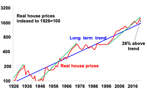 The past 100 years has seen 3 major long-term booms in Australian home prices – in the late 1920s, the post WW2 period and since the late 1990s. These are highlighted with green arrows in the next chart that shows real house prices back to 1926. The boom over the last 25 years has largely been driven by the shift from high interest rates to low interest rates and a surge in population relative to housing supply.