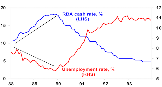 This lag was evident in the late 1980s and early 1990s. Despite the RBA progressively hiking rates to 18% over 1988 and 1989 the unemployment rate kept falling prompting many to argue the economy was impervious. But then in late 1989 and early 1990 the lagged impact of rate hikes hit and the economy went into deep recession with the RBA having to rapidly reverse course. It was a classic case of the economy being ok until it’s not!