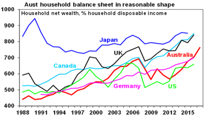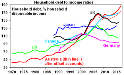 If Australia has an Achille’s heal it’s the high and still rising level of household debt that has gone hand in hand with the surge in house prices relative to incomes. Whereas several comparable countries have seen their household debt to income ratios pull back a bit since the Global Financial Crisis (GFC), this has not been the case in Australia. Some worry Australians are unsustainably stretched, and it is only a matter of time before it blows up, bringing the economy down at the same time. Particularly now that global interest rates are starting to rise. This note looks at the main issues.