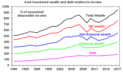 And on this front, the rise in the stock of debt levels has been matched by a rise in total household wealth in Australia. Thanks to a surge in the value of houses and a rise in financial wealth, we are far richer. Wealth rose 9.5% last year to a new record. The value of average household wealth has gone from five times average annual after tax household income in 1990 to 9.5 times today.