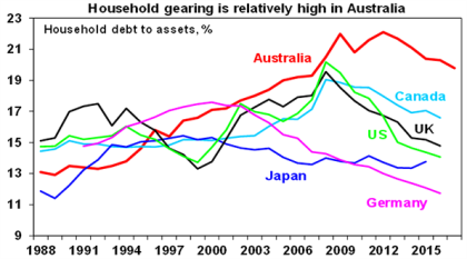 None of this is to say the rise in household debt is without risk. Not only has household debt relative to income in Australia risen to the top end of comparable countries but so too has the level gearing (ie the ratio of debt to wealth or assets).