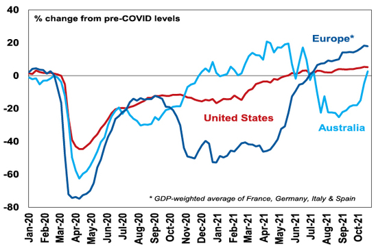 Second, economies have been recovering with coronavirus outbreaks having smaller impacts on economic activity. And in Australia recovery now looks to be back on track after the recent east coast lockdowns. This is evident in a sharp rebound in our Australian Economic Activity Tracker.
