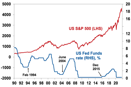 Even if the first rate hikes from the Fed and RBA are sooner than we anticipate, the experience of the last 30 years suggests an initial dip in shares around the first rate hike but then the bull market resumes – and continues until rates become onerously tight which weighs on economic activity and profits. This can be seen in the next chart. Shares had wobbles when interest rates first started to move up in February 1994 (US shares had a 9% correction), in June 2004 (US shares had an 8% correction) and in December 2015 (US shares had a 13% correction) but thereafter they resumed their rising trend and a bear market did not set in till 2000, 2007 and 2020 after multiple hikes. Recession did not come for seven years after the February 1994 first hike, for three and a half years after the June 2004 first hike and for four years after the December 2015 first hike. This is because the first rate hike only takes monetary policy to a bit less easy, and it’s only when monetary policy becomes tight after numerous rate hikes that the economy gets hit.
