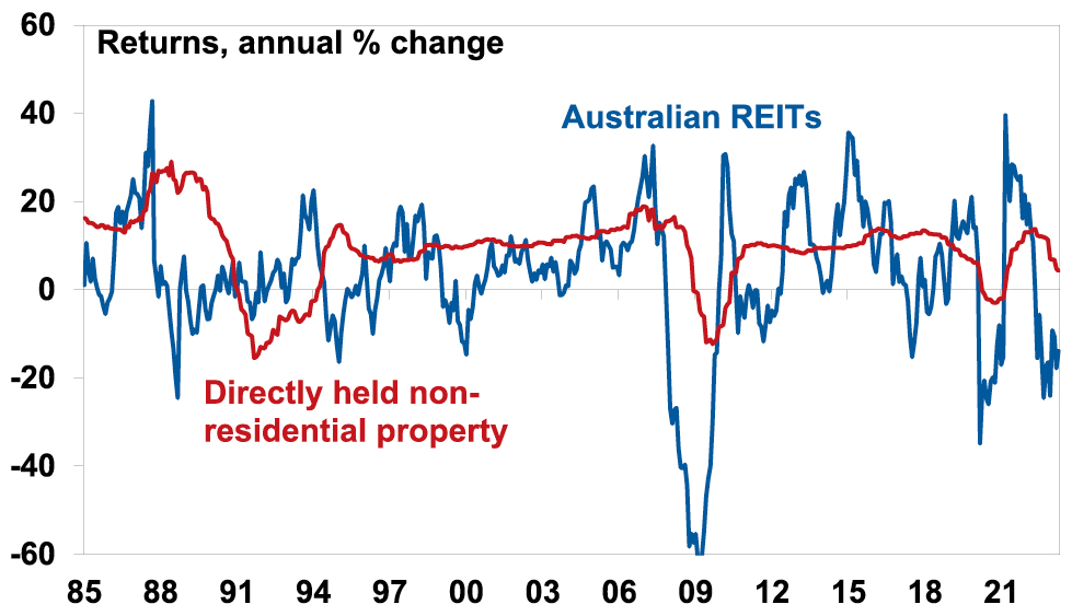 This cyclical relationship can also be seen by comparing the returns from Australian Real Estate Investment Trusts (A-REITs) and directly held (ie, unlisted) non-residential property returns. The former are correlated with the share market. This makes them highly volatile but means they often provide a good lead for unlisted commercial property. Their weakness since January last year signals rougher times ahead for unlisted commercial property and returns have started to slow to reflect this.