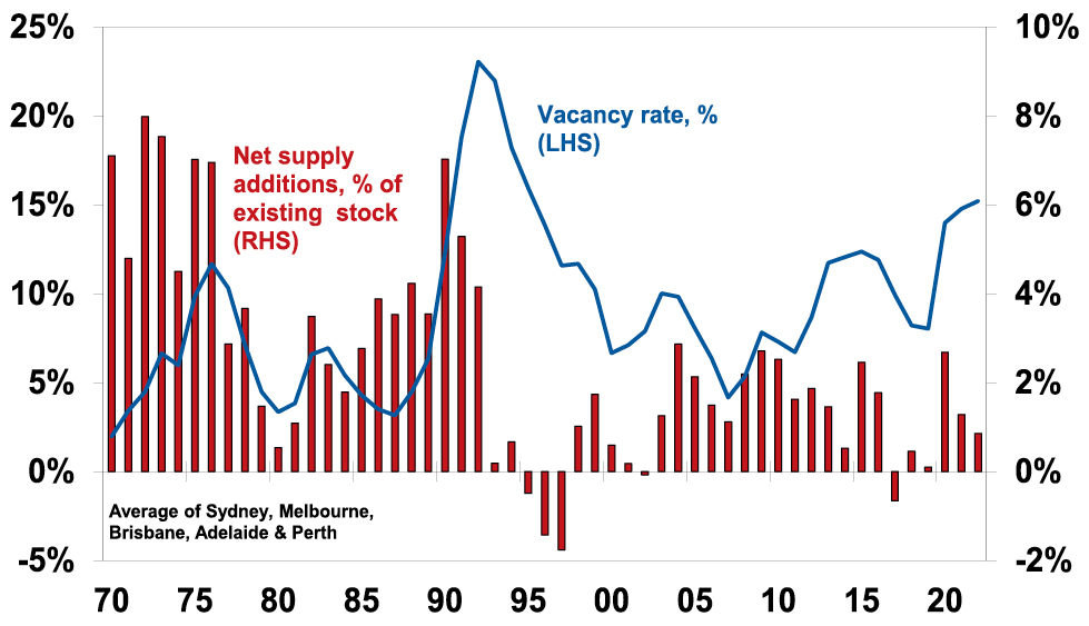 It assumes that rental and capital growth will average 2.5% pa over time (ie, in line with targeted inflation) and adds this to the average unlisted non-residential property yield to give a guide to potential total returns. The 10-year bond yield has been subtracted to show a property risk premium. Despite the collapse in property yields in late 2020 it reached a record high of more than 6.7% thanks to plunging bond yields at the time below 1%. Since then, the rise in bond yields has seen the risk premium plunge to levels not seen since the 2000s, but at around 4% it’s still relatively high. But there are two threats here. The first is if bond yields continue to rise reversing the yield chasing investor flows that commercial property has benefitted from over many years. And even if bond yields don’t rise further there is a risk that the reduced property risk premium may not be enough to keep investors happy given the outlook for deteriorating leasing conditions ahead.