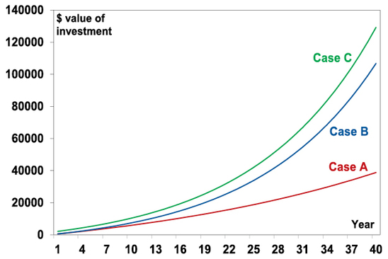 Time – the longer the better as it means the longer the compounding process of earning returns on returns has to run. Time also helps smooth out any year-to-year volatility in returns. After 40 years the investment strategy in Case A will have grown to $38,832 but Case B will have grown to $106,805 and Case C will have grown to $129,267.